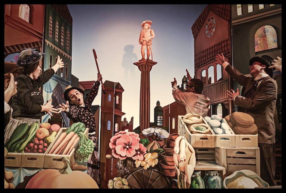 Hudební groteska Gašpariáda Jiřího Jelínka se navrací k tradici loutkářství, buffonádě, commedii dell’arte a kombinuje živého herce, loutky, verbální projev i zpěv.